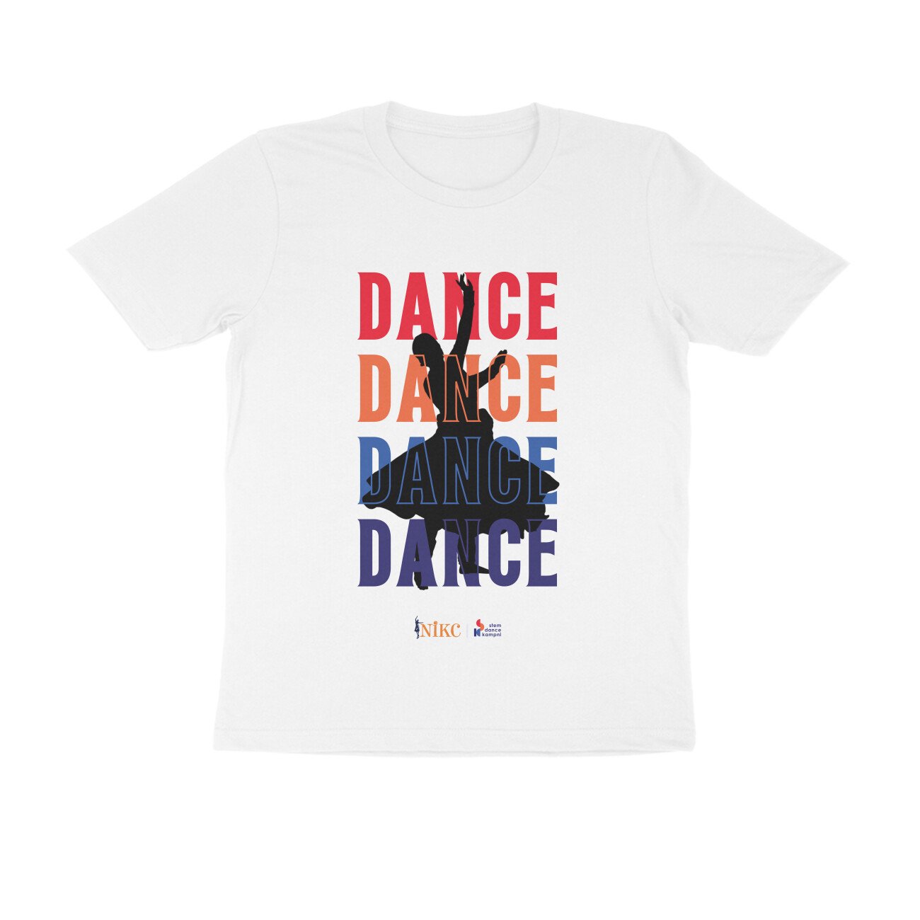 Make a statement with this stunning white tee that captures the essence of Kathak. The design features a graceful dancer silhouette set against vibrant “DANCE” typography in red, orange, blue, and navy each color representing the energy and passion of classical dance. A collaboration between Natya Institute and STEM Dance Kampni.